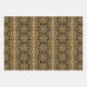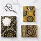 Set of three wrapping paper sheets with different patterns. Each sheet features a seamless pattern made of geometric shapes in faux gold and black.