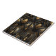 This ceramic tile has a cool pattern in gold and black that looks like a 3D cityscape. It's shiny and has lots of shapes that fit together in a fun way. The design also has a neat effect that looks like light shining on it. This tile can make any space look more exciting and stylish.