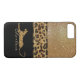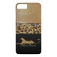 Stylish iPhone 7 case done in solid black, on the bottom half of the case and graphics of a gold glitter look, on the top half. Graphics of a tan, brown and black leopard spotted ribbon, runs across the middle and a leopard decorates the black bottom of the case. Personalise the tan text to read what you want. Great personalised gift idea.