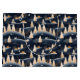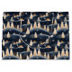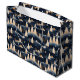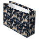 This gift bag features a serene winter landscape—dusty blue snow blanketing the earth, glowing white pine trees stretching towards a twilight sky, charming gold houses twinkling with the promise of warmth, and a lone white dog meandering through the scene as if on a magical journey.