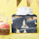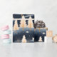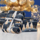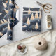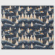 This wrapping paper features a serene winter landscape—dusty blue snow blanketing the earth, glowing white pine trees stretching towards a twilight sky, charming gold houses twinkling with the promise of warmth, and a lone white dog meandering through the scene as if on a magical journey.