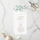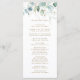 This wedding program features painted watercolor eucalyptus, botanical green and gold glitter leaves with gold script.