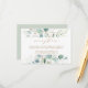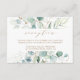 This wedding reception enclosure card features painted watercolor eucalyptus, botanical green and gold glitter leaves with gold script.