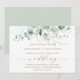 This wedding invitation features painted watercolor eucalyptus, botanical green and gold glitter leaves with modern gold script.