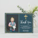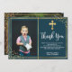 Simple, elegant Gold and Navy Blue christening and baptism thank you cards. Send thanks to family and friends with this modern personalised thank you religious flat card. It features hand lettered ”Thank You” script, around double faux gold foil frame and gold glitter confetti on navy background. This modern beautiful photo thank you card will also be perfect for baptism / christening / naming ceremony / confirmation and holy communion thank you card for boy or girl. #3354