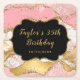This elegant and glamourous birthday coaster features a pink and white agate marble background with faux gold glitter accents. The text combines handwritten script and modern sans serif fonts for a classy and sophisticated look. The sequins and distressed texture creates the perfect blend of chic and grunge.