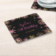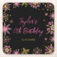 This elegant and glamourous coaster features watercolor gold and pink faux glitter snowflakes and sparkles on a black background. The text combines handwritten script and modern sans serif fonts for a classy and sophisticated look. This is perfect for a winter or Christmas birthday party.