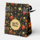 Gold Christmas snowflakes, stars, and red and gold ornaments over a black background. Optional custom text in black on a gold tones background.