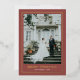 Simply elegant holiday photo card features a portrait picture with a decorative yet minimalistic gold foil border frame of intersecting stripes. Includes "Merry Christmas" wording in beautiful scrolling serif typography with dark marsala red coloured background - can be modified. Bonus optional photo and wording can be personalised on the back of the card.