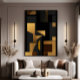 This abstract artwork is a dialogue between the luxury of gold and the depth of shadow. Precise geometries—rectangles, triangles, curves—intertwine like musical notes, creating a visual rhythm that invites the eye to explore each layer. Golden hues radiate sophistication, while intense blacks add drama, resulting in a piece that balances modernity and timelessness. Ideal for spaces seeking elegance without sacrificing personality.