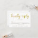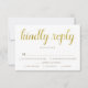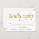This elegant RSVP card is perfect for a golden anniversary. The white and gold response card features the phrase "kindly reply" written in beautiful gold calligraphy. Customise the text below with your response date and meal choices.