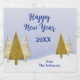 This New Year wine or sparkling wine label is ready to be personalised with your own text. Printed with a modern abstract style cluster of three Christmas trees in gold and white colours on a snowy blue background.