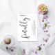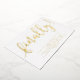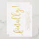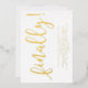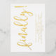 A minimalist typographic engagement party invitation. This design features the word "finally!" in bold gold foil hand lettered font and party details in modern sans serif font, all on a white background.
