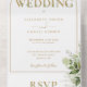 An all-in-one wedding invitation featuring pretty greenery and chic gold arch and typography. The invitation includes a perforated RSVP card with your wedding website QR code. Designed by Thisisnotme©