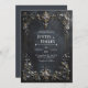 Invite your guests to a celebration of opulent luxury and dramatic elegance with this exquisite wedding invitation. The design features a stunning, rich dark navy and charcoal distressed background, giving it a luxurious, antique texture with subtle gold and gray veins. A prominent ornate gold baroque rectangular frame dominates the scene, heavily detailed with intricate scrolling foliage and blue floral accents. The top and bottom centers are anchored by large sculpted medallions featuring stunning faceted blue gemstones. This entire frame is lavishly draped with delicate blue forget-me-not style flowers and dark gold foliage. This aesthetic conveys a deep, sophisticated richness, perfectly setting the stage for a dramatic, high-end, or formal evening wedding. This invitation card is ideally suited for a masquerade ball wedding reception, a formal historic venue ceremony, or a sophisticated gala anniversary celebration. It would also perfectly suit a regal winter holiday engagement party or an elegant black tie New Year's Eve event. The card's captivating blend of ornate gold accents and deep-toned florals ensures it is versatile for any solemn ceremony, corporate gala, or refined birthday announcement.