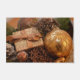 A decorative, gold bauble is displayed with a glitter wrapped present with a brown bow.