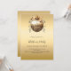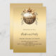 An invitation for a Christmas Party. A faux gold looking background. Decorated with a large golde vintage looking bauble. Personalise and add the details. Black text.