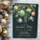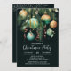 Elegant Christmas holiday party invitations feature pine branches, green and gold Christmas ball ornaments and ribbons on a black background with your details in chic lettering, perfect for your festive holiday gathering. MATCHING items in our collection.