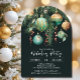 Elegant arch top Christmas holiday party invitations feature pine branches, green and gold Christmas ball ornaments and ribbons on a dark green background with your details in chic lettering, perfect for your festive holiday gathering. MATCHING items in our collection.