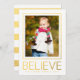 Printed Gold Foil Believe Contemporary Holiday Photo Card. Elke Clarke © Available at www.zazzle.com/monogramgallery. Send out your Christmas holiday greetings to your friends and family using this beautifully, simple classic holiday photo card with the word "Believe" in gold typography text photo frame design in a vertical card format. Replace sample photo with your own. Printed photo effect of gold foil and white striped background on back of card. Other colours available for lined pattern and colour of the word believe in our store.