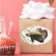 A gorgeous gold and pink halfmoon betta with flared fins swims across the front of this product against delicate gold swirls.