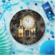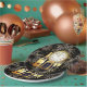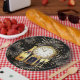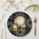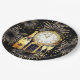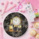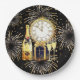 Festive 2023 New Year's Eve party paper plates, with champagne glasses, and clock nearing midnight.