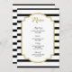 Wedding dinner menu in elegant black and white stripes pattern and gold details, customisable with your details and available in matching wedding products.
