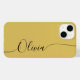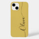 Gold Black Elegant Calligraphy Script Custom Personalised Name iPhone 14 Smart Phone Cases features a modern and trendy simple and stylish design with your personalised name in elegant hand written calligraphy script typography on a gold background. Designed by ©Evco Studio www.zazzle.com/store/evcostudio