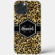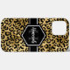 Chic gold and black leopard print iphone 13 pro max case with a custom name and monogram template. A cute and trendy safari animal print pattern background topped with your own bit of personalisation.