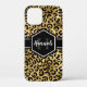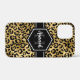 Chic gold and black leopard print iphone 12 mini case with a custom name and monogram template. A cute and trendy safari animal print pattern background topped with your own bit of personalisation.