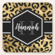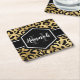 Chic gold and black leopard print paper coasters with a custom name and monogram template. A cute and trendy safari animal print pattern background topped with your own bit of personalisation.
