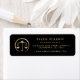 Modern elegant attorney address labels features gold icon of scale of justice on a black background and address on the front. .