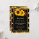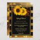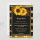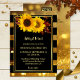 Elegant wedding invitation featuring sunflowers, autumn leaves and gold floral swirls on a black and sparkling gold striped background. On the back is a QR code template which you can easily customise or delete if you do not need it.