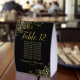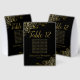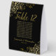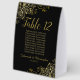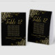 These elegant black and gold table tent signs will make it easy for your guests to find their seats, and also make your wedding reception more beautiful. The feature a simple design with a lacy script calligraphy title with the table number and space for the names of 10 guests. Below is space for the names of the couple and the wedding date. The corners are decorated with lacy floral curls and swirls. Great way to add a touch of formal class to your reception.
