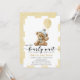 Watercolor gold blue bear with balloon invitation for baby boy shower.