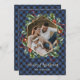 Elegant blue and gold custom watercolor photo Christmas cards with calligraphy title and featuring a geometric photo frame adorned with a botanical wreath. Easily personalise these blue buffalo plaid photo Christmas cards with your an image and a family name.