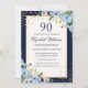 Gold Blue floral Sparkle 90th Birthday Invitation