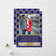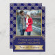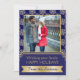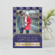 Gold, blue snowflake pattern and frame Christmas flat photo card featuring a PRINTED image of a gold snowflake with jewels, a navy blue frame with gold outline, a gold banner and a pattern with snowflakes. This modern, elegant and stylish template design is totally customisable and is perfect for your holiday greetings.