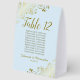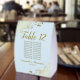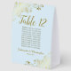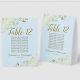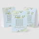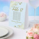 These elegant gold and light powder blue tent signs will make it easy for your guests to find their seats, and also make your wedding reception more beautiful. The feature a simple design with a lacy script calligraphy title with the table number and space for the names of 10 guests. Below is space for the names of the couple and the wedding date. The corners are decorated with lacy floral curls and swirls. Great way to add a touch of formal class to your reception.