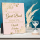 This elegant self standing sign or plaque will welcome guests to sign your wedding guest book. It features a simple sophisticated yet fancy design with gold text on a light blush pink coloured background with a gold faux foil frilly floral filigree in the corners.