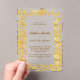 A clear, transparent background decorated with a a faux gold botanical pattern and text.