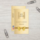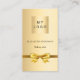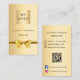A faux gold looking background. Decorated with a golden bow. Personalise and add your business logo, name, title and contact information. Add your website url/link to the Qr code. With Facebook and Instagram icons. Black text.