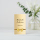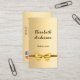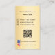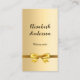 A faux gold looking background. Decorated with a golden bow.  Personalise and add your name, title and contact information.  Add your website url/link to the Qr code. With Facebook and Instagram icons. Black text.