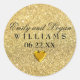 A very pretty and sparkling gold background provides the perfect frame for this wedding sticker. The bride and groom first names are written in a formal and elegant script. Their last name is written in larger and simpler text and their wedding date is below that. Small gold heart provides balance and romantic nuance. A glamourous way to seal wedding favour bags, wedding cake boxes and thank you note envelopes. All of the text is easy to change. You can also choose new fonts, change the size and colour of the text. Don't want the heart, just delete it. It's easy to use this gold wedding sticker template.