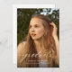This graduation announcement features a large, full front photo with calligraphy script overlay in faux gold foil and a second photo on the back along with your graduation party invitation. The back elements can be removed by clicking the button to edit further.