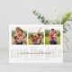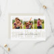 this design features gold calligraphy script multi photo, a simple minimalist 3 three picture, a modern classic save the date, a wedding engagement engaged couple, a trendy stylish calligraphy script, a creative simple typography style, an editable simplistic contemporary design, a monogram monogrammed initial back side, a photo collage simple clean grid, a beige tan gold golden colour