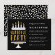 This adult surprise party invitation features a white birthday cake with candles and "SURPRISE PARTY" in faux gold glitter. This horizontal design has cake on the left and modern birthday party typography to the right. On the reverse there is a white and gold glitter polka dot pattern on a black background. This black, white and gold design is perfect for adults of all ages. Please note that no actual glitter will be used to make this product - they are flat images.