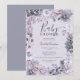 Love is in bloom! Our pretty baby shower invitation features pastel lavender and dusty blue floral watercolor with pretty and beautiful flowers on light lavender, leaves and floral frame border with gold confetti and elegant script brush.