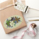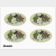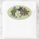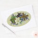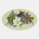 vintage painting with a gold christian cross with white border and beautiful large white flower and buds with green leaves in front of it, and a lovely spray of purple flowers behind the cross.vintage watercolor painting in gold and green. watercolour painting in golds and greens.