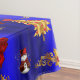 A colourful blue Christmas tablecloth with a cheerful and festive pattern of gold Christmas trees, snowmen dressed in red velvet, gold holly leaves with red berries and giant red silk Christmas bows to add a very merry touch to your Christmas entertaining and dining this holiday season.